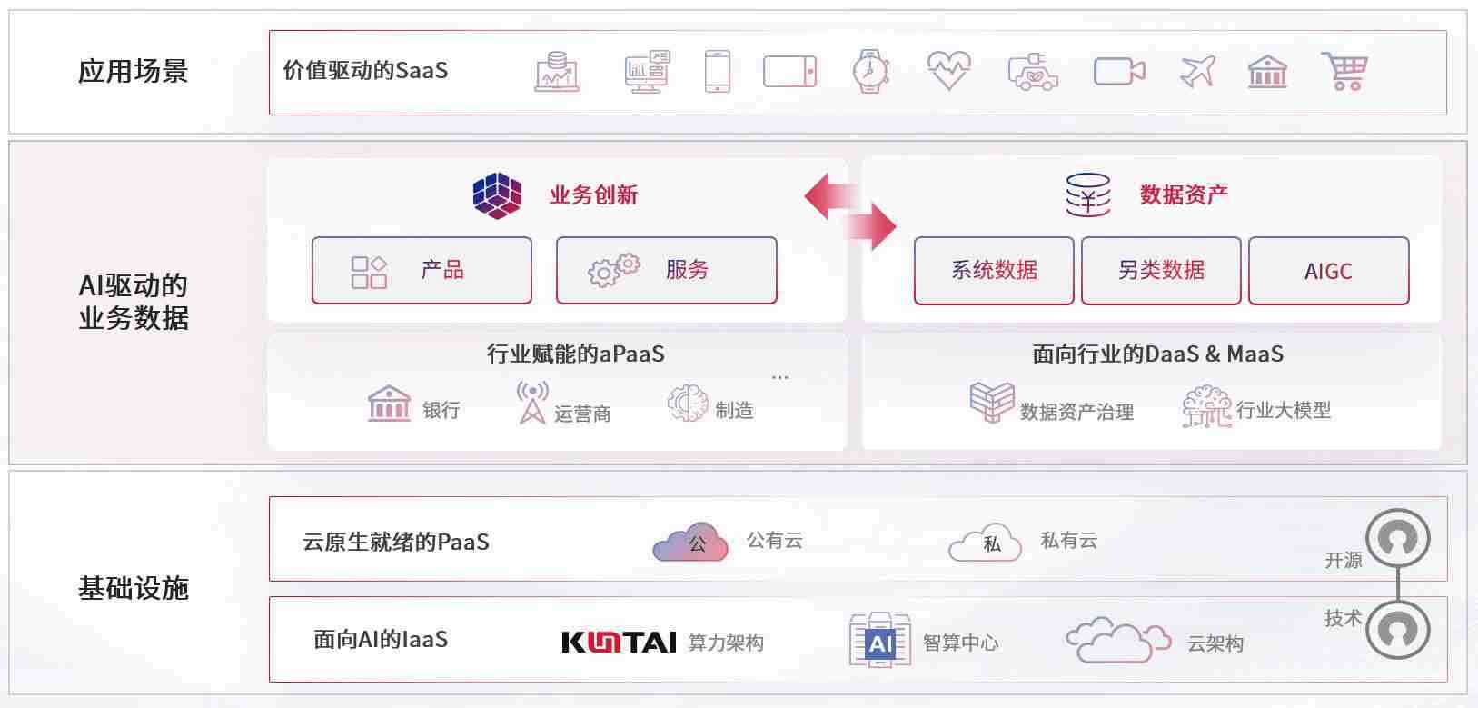 数字时代,,围绕企业数字化转型的关键要素,,,南宫娱乐数码开创性的提出数云融合战略和技术体系框架,,着力在云原生、、、、数字原生、、、AI原生和信创产业上架构产品和服务能力,,,,为处在不同数字化转型阶段的快消零售、、、汽车、、、、金融、、、医疗、、政企、、、教育、、、运营商等行业客户提供泛在的敏捷IT能力和融合的数据驱动能力,,,构建跨界融合创新的数字业务场景和新业务模式,,,,助力企业级客户建立面向未来的核心能力和竞争优势,,全面推动社会的数字化、、、智能化转型升级。。。