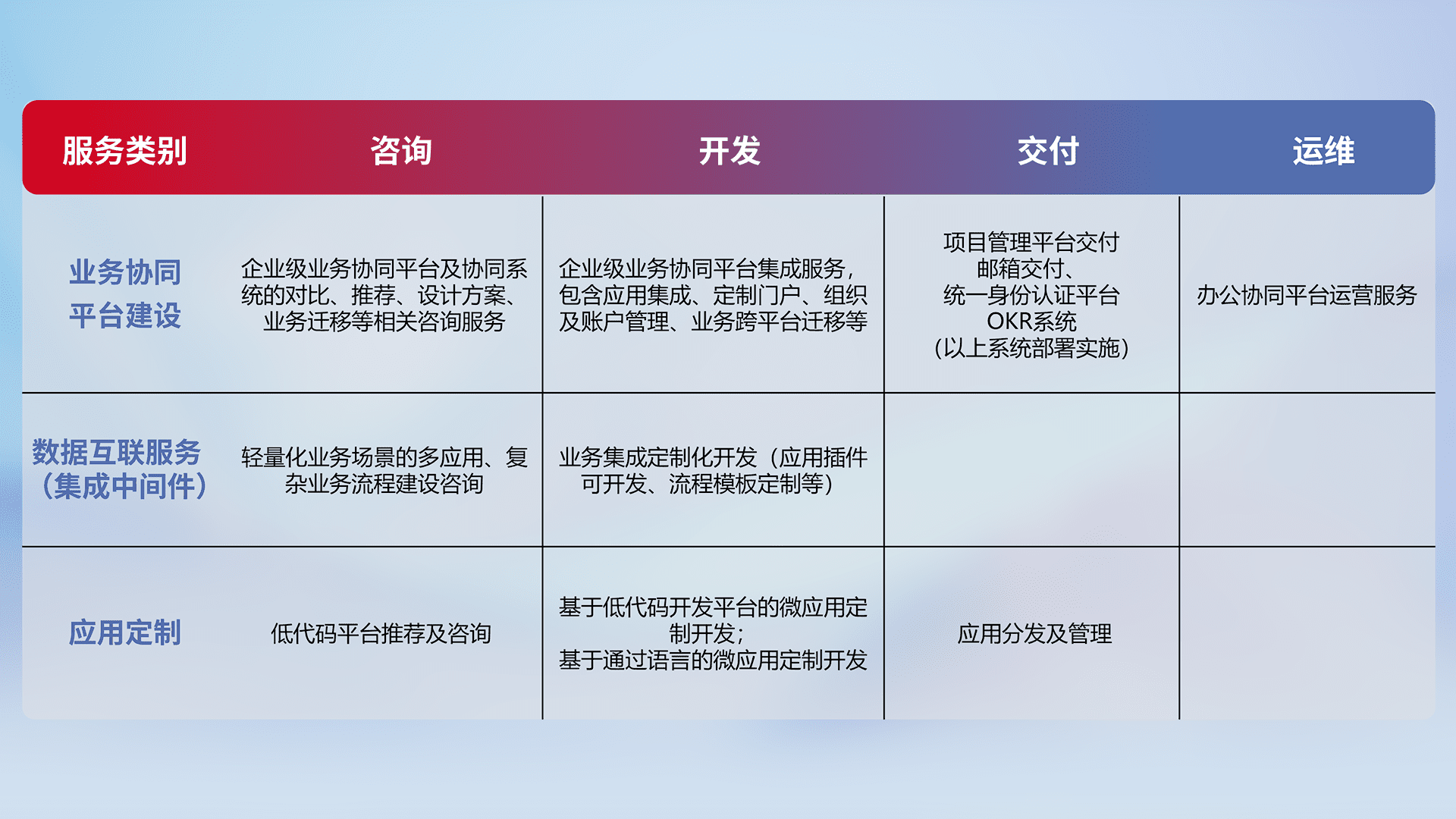 针对钉钉、、企微、、IDaas等平台级产品提供产品的规划、、、方案、、交付、、、定制化开发等服务,,,实现如统一协同办公、、、智能客户服务、、、混合会议管理、、、、智能数据查询、、等业务场景,,,,实现数字化转型。。。